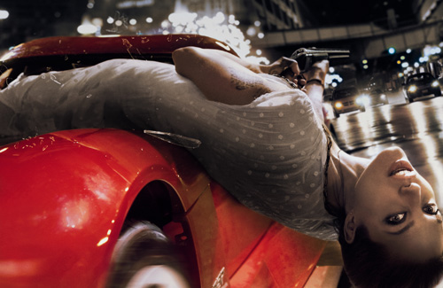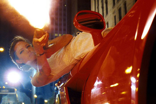 アンジーが真っ赤なダッジ・バイパーのボンネットの上でハンドルを操作しながら銃を撃ちまくりです!!!